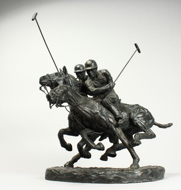 A SUPERB BRONZE POLO GROUP, TWO POLO PLAYERS ON HORSEBACK.