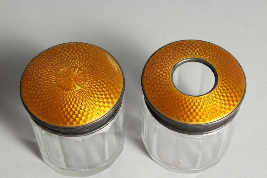 A PAIR OF SILVER AND YELLOW ENAMEL JARS
