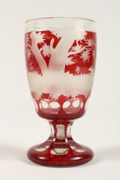 A GOOD BOHEMIAN RUBY GLASS GOBLET etched with deer in a landscape.