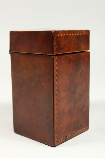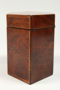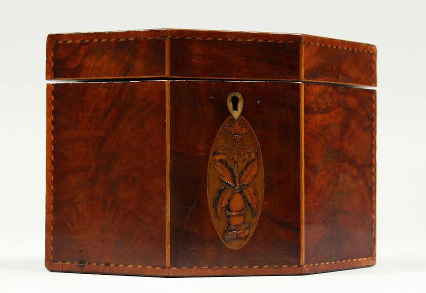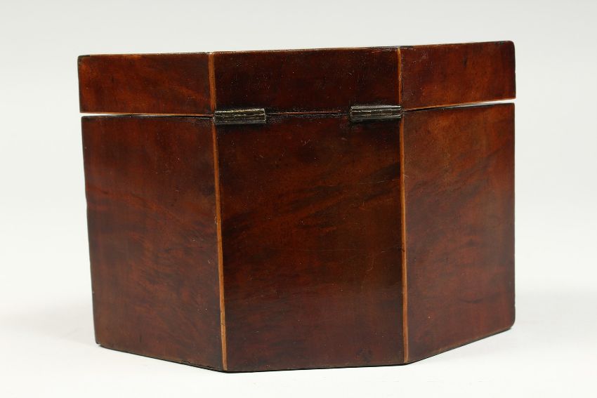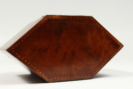 A GOOD GEORGE III MAHOGANY HEXAGONAL SHAPED TEA CADDY with satinwood stringing and oval.