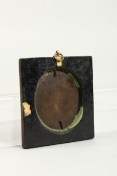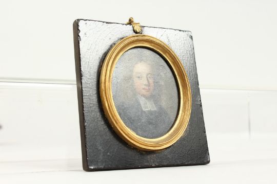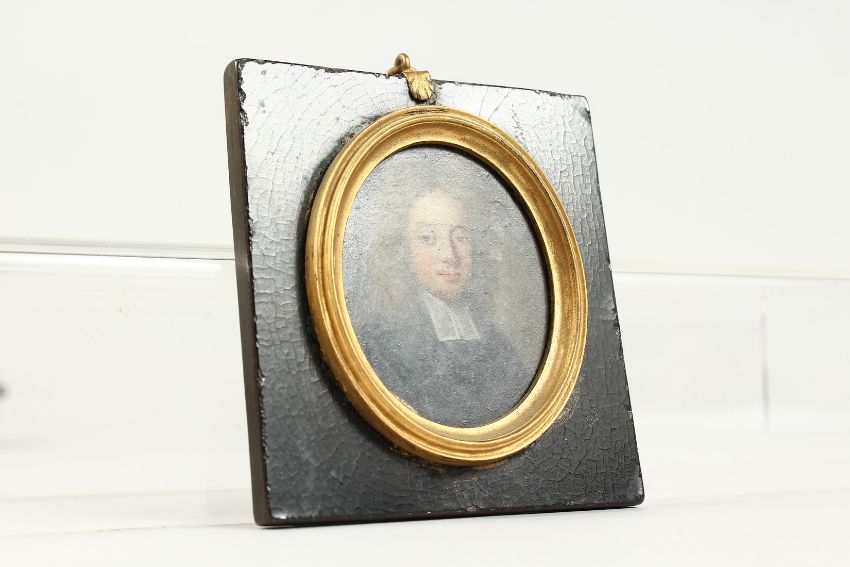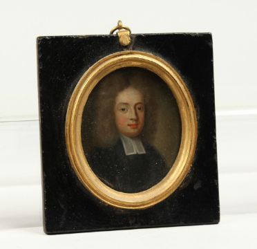 A SMALL 18TH CENTURY OVAL MINIATURE OF A CLERK, on copper.