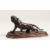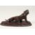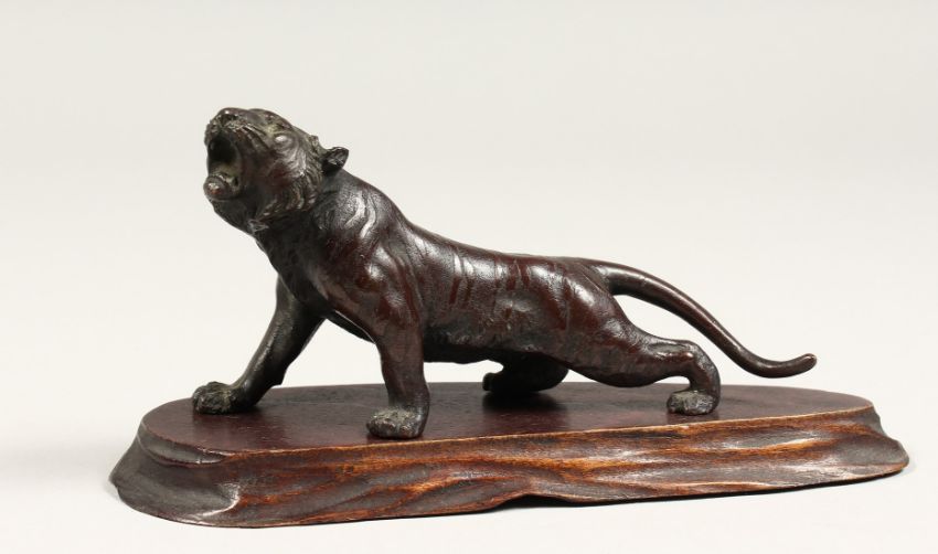 A SMALL JAPANESE BRONZE TIGER on a wooden base