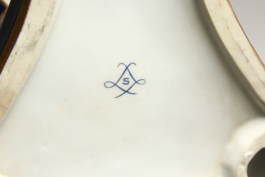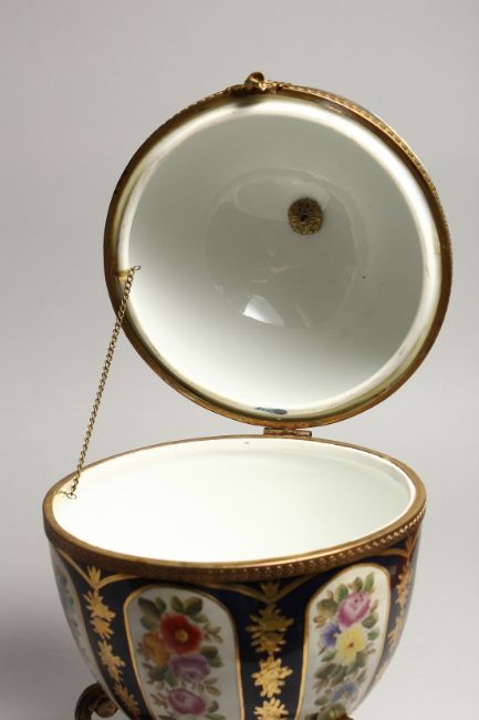 A LARGE SEVRE STYLE BLUE AND GILT EGG SHAPED CASKET AND COVER, painted with flowers on a triangular base.