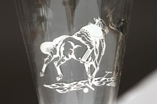 A ROCKWELL SILVER CO. POLO, SILVER, OVERLAY GLASS VASE.