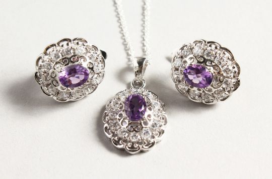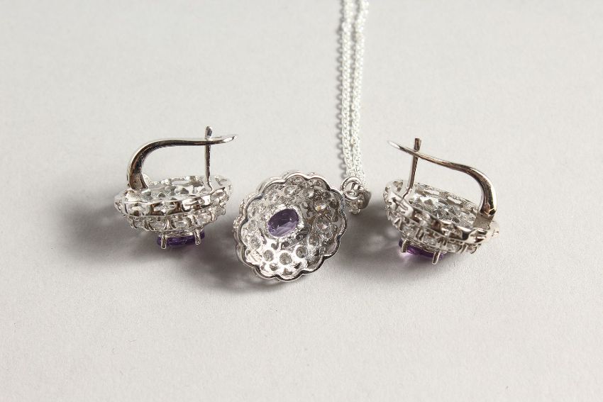 A SILVER AMETHYST NECKLACE AND EARINGS.
