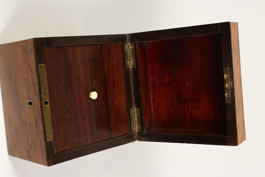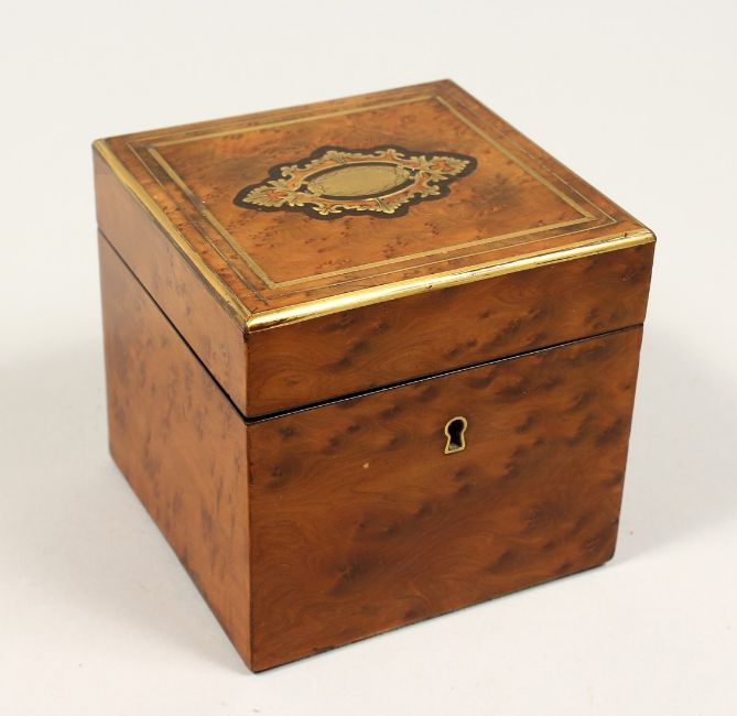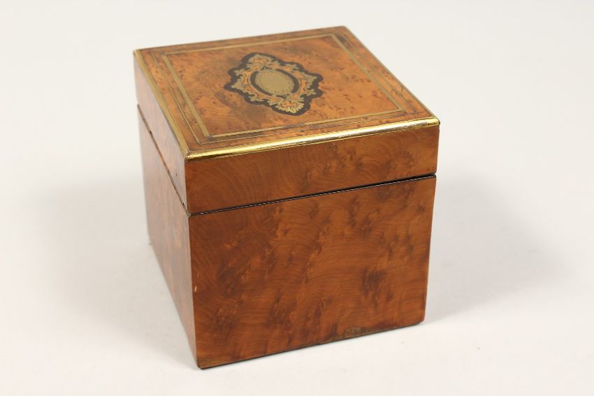 A FRENCH THYA WOOD SQUARE TEA CADDY the top with brass inlay.