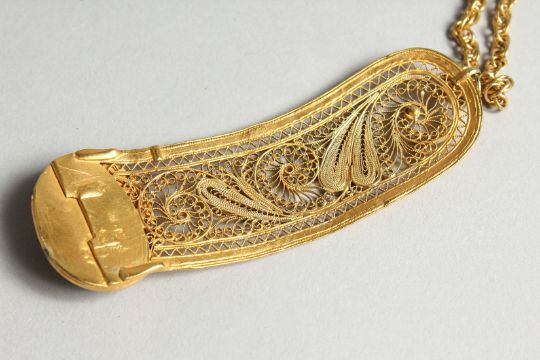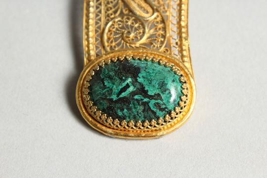 A FILIGREE AND GREEN STONE PENDANT AND CHAIN.
