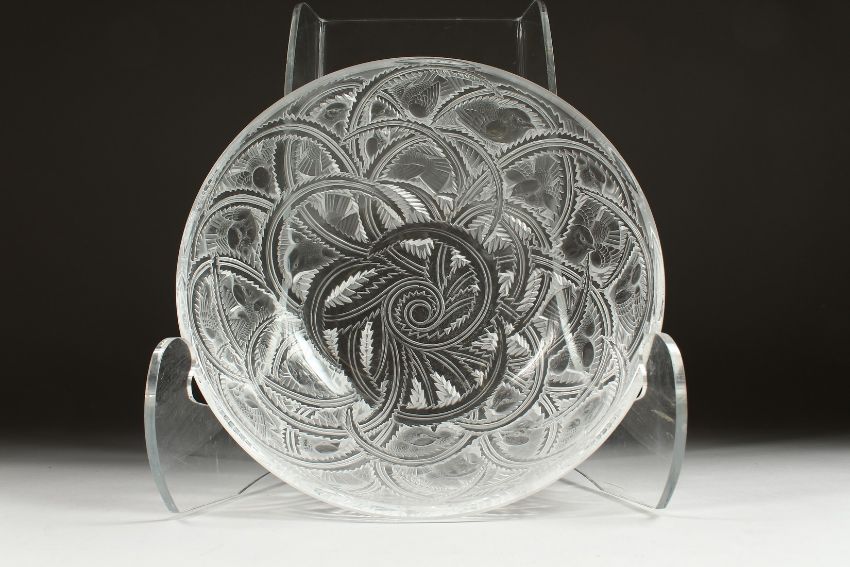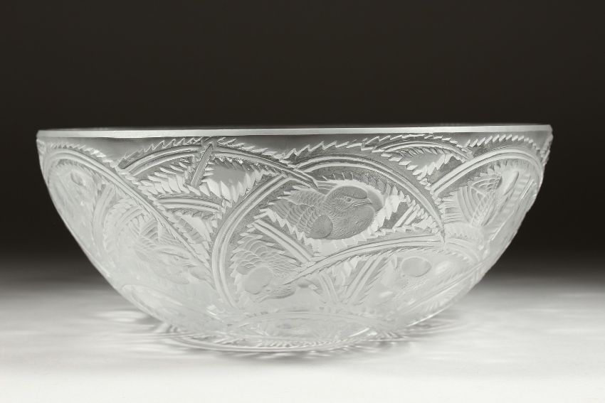 A GOOD LALIQUE GLASS CIRCULAR BOWL etched with birds