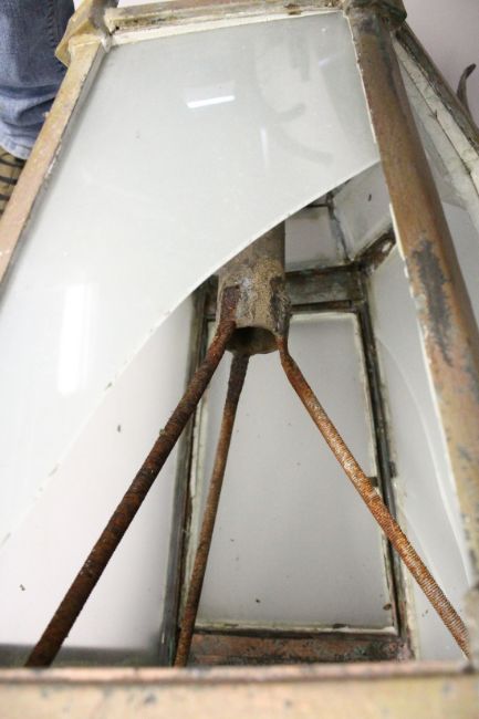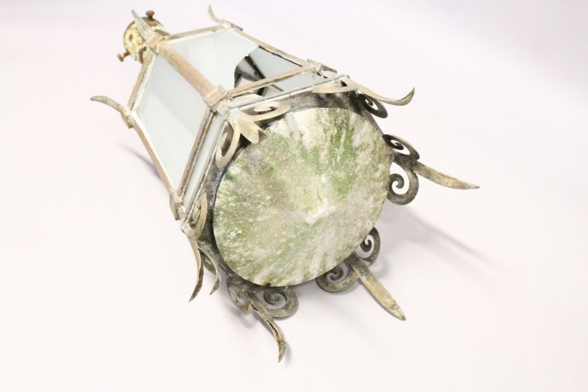 A GOOD LARGE VICTORIAN, METAL HANGING OCTAGONAL SHAPED LANTERN, with frosted glass panels.