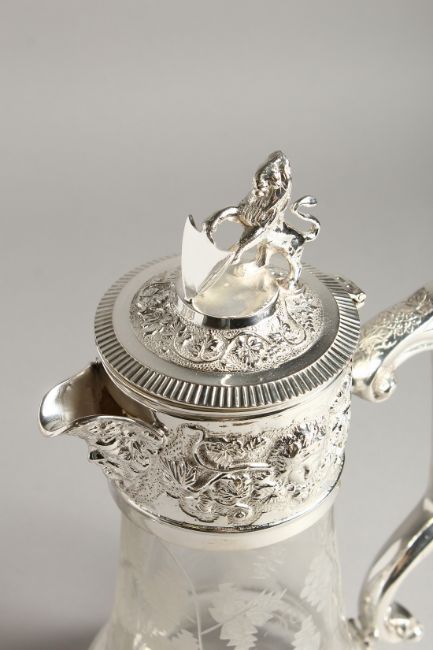 A PAIR OF CLARET JUGS engraved with fruiting vines, with plated mounts