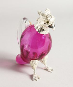 A SMALL CRANBERRY GLASS BIRD CLARET JUG with plated mounts.