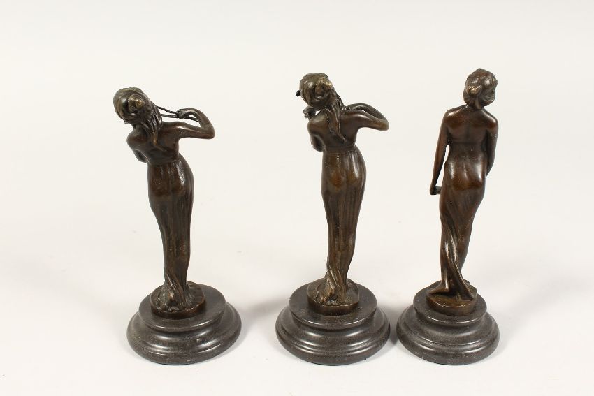 A SET OF THREE ART NOUVEAU BRONZE FEMALE MUSICIANS on a circular base.