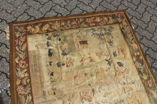 A GOOD 18TH CENTURY FRENCH TAPESTRY decorated with many figures within a floral border.