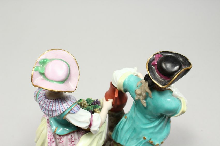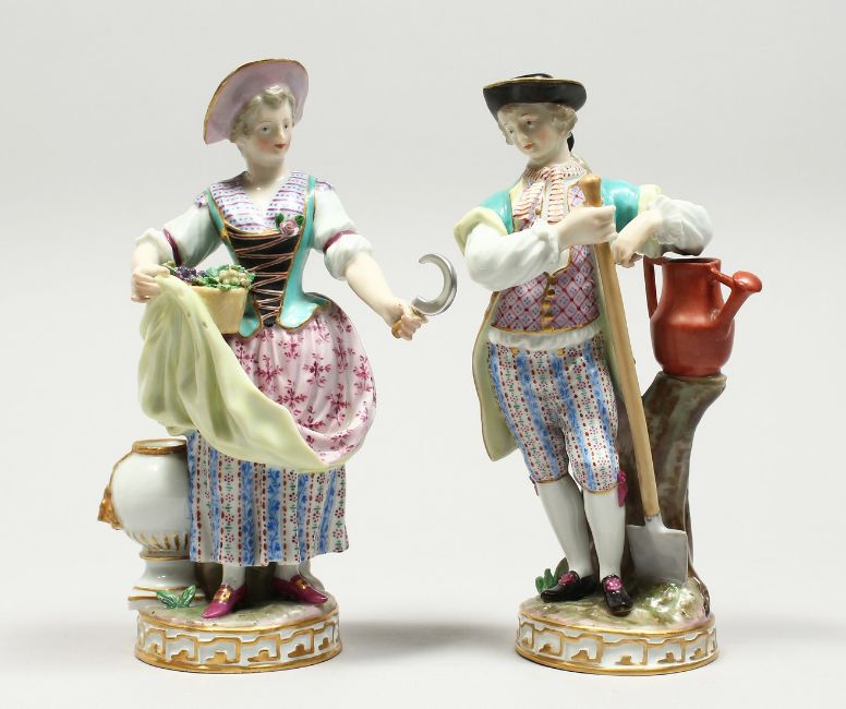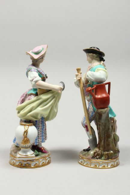 A VERY GOOD PAIR OF MEISSEN PORCELAIN FIGURES, GARDENER AND GARDENERESE, the man standing holding a spade, the woman holding a sickle, on a circular gilt base.