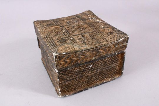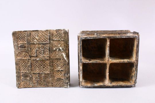 A 19TH CENTURY EGYPTIAN CARVED STONE LIDDED MEDICINE BOX, carved with four sections, and a keyed exterior decor, 15cm x 14cm deep x 10cm high.