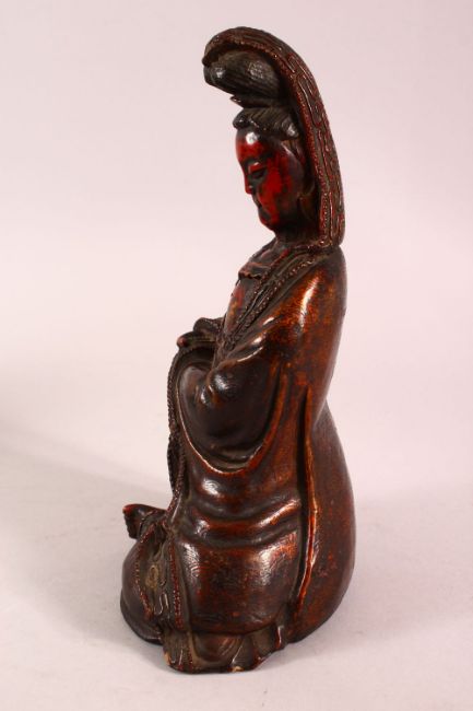 A CHINESE LACQUERED WOOD FIGURE OF GUANYIN, in a seated pose, 25.5cm