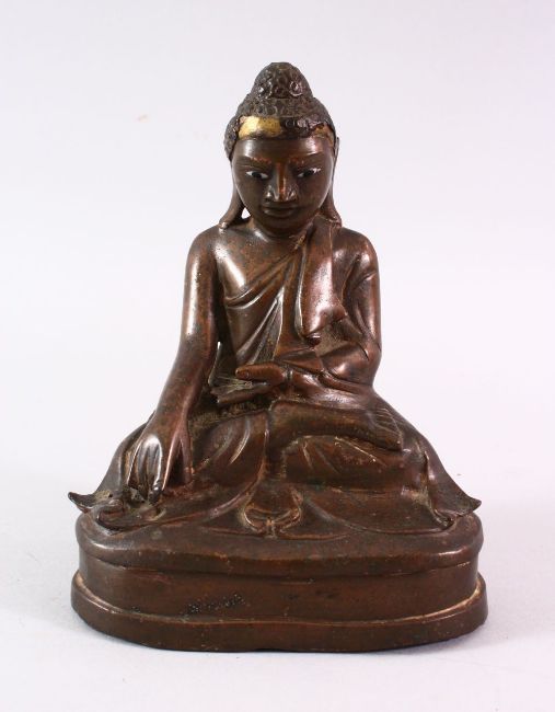 A BRONZE BUDDHA with glass inset eyes, 16cm high.