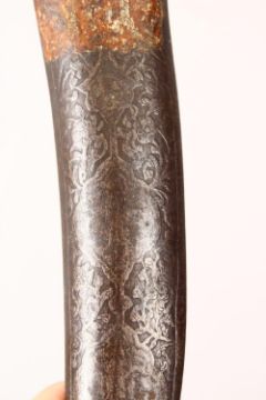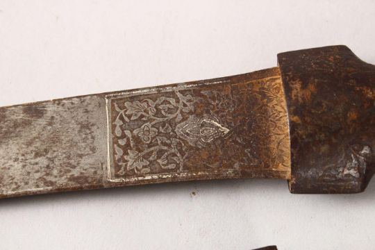 AN EARLY QAJAR STEEL DAGGER, the sheath carved with scrolling foliage, the blade with traces of silver inlay and calligraphy, 45cm long