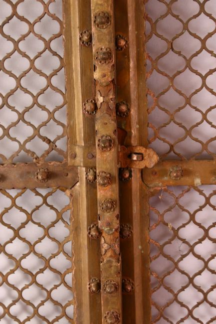 A PAIR OF INDIAN CARVED ROSEWOOD ARCHED WINDOW SHUTTERS, with wire work infill's, 87cm x 27cm
