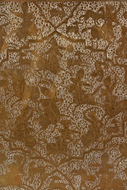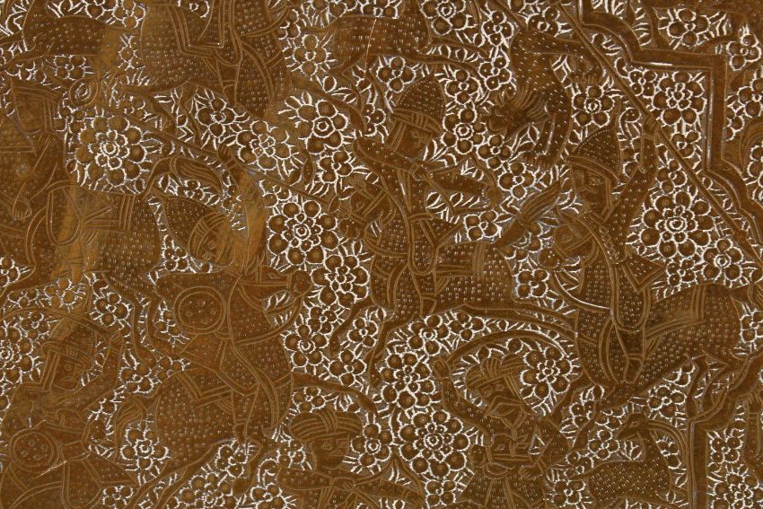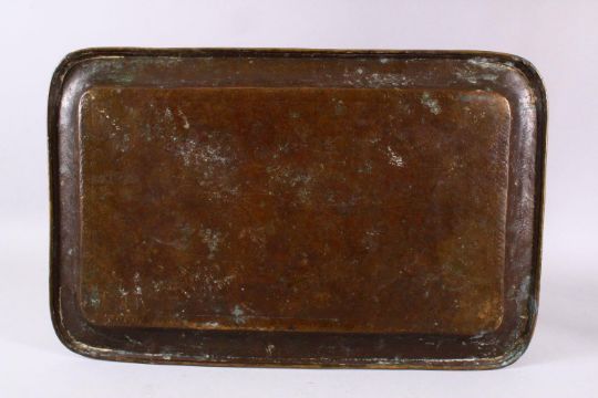 A GOOD PERSIAN QAJAR ENGRAVED HUNTING SCENE BRASS TRAY, carved with various hunting scenes, around scrolling foliate decoration, 52cm x 33cm