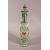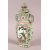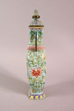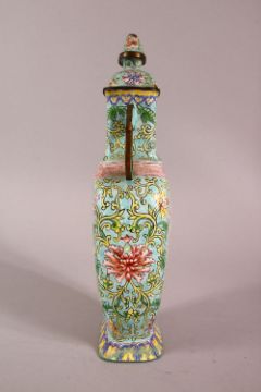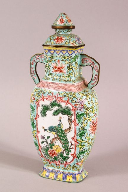 A GOOD CHINESE CANTON ENAMEL VASE & COVER, with tin handles, the body decorated with a panel of peacocks and trees, with floral decoration upon turquoise ground, 23cm high.