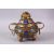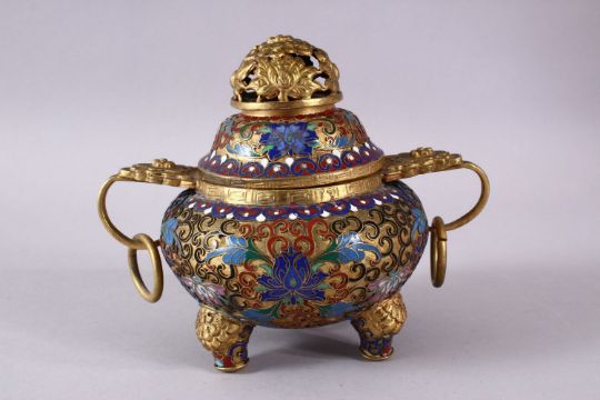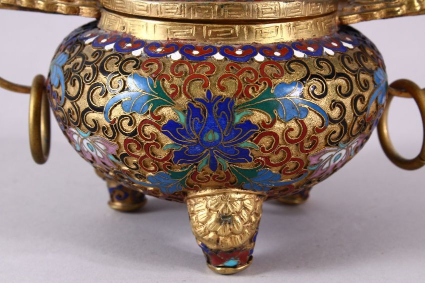 A CHINESE CLOISONNE TRIPLE FOOT CENSER & COVER, with raised enamel decoration of lotus, triple feet and twin handles with rings, the cover with lotus, ruyi and a lion dog finial, 14.5cm high x 17cm wide.