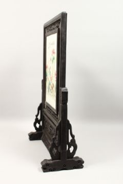 A CHINESE PORCELAIN SCREEN, with flowers and calligraphy, 14ins x 9.5ins on a wooden stand.