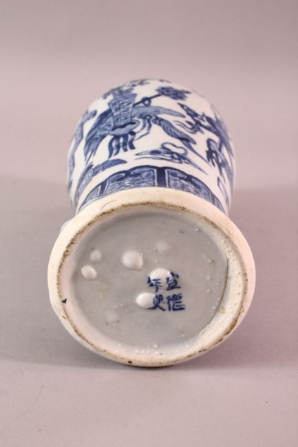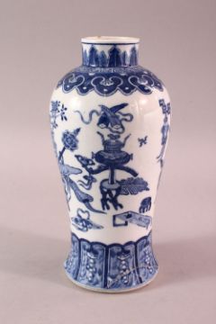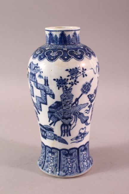 A CHINESE BLUE & WHITE PORCELAIN VASE, decorated with precious object and floral display, the base with a mark, (af) 23.5cm