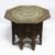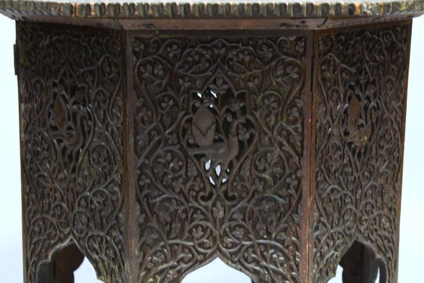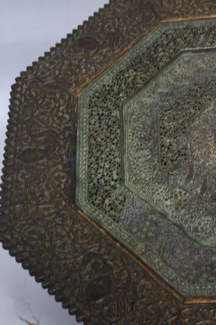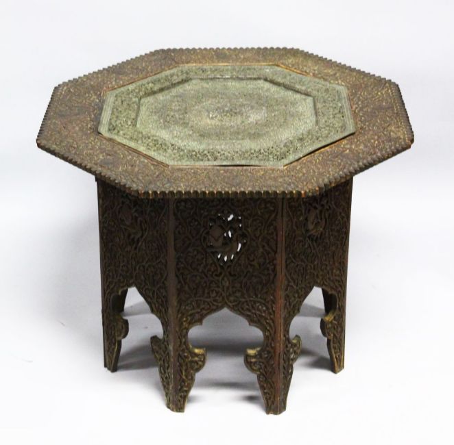 A GOOD LATE 19TH CENTURY PERSIAN CARVED HARDWOOD AND BRASS OCTAGONAL SHAPED TRAY TOP TABLE, inset with a well pierced and chased foliate design, tray supported on folding base, 73cm diameter, 56cm high.