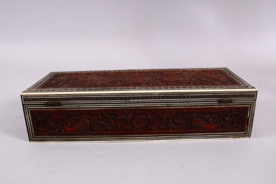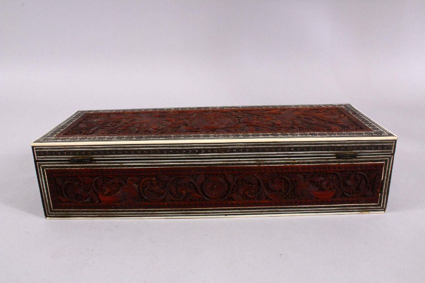 A 19TH CENTURY INDIAN CARVED AND INLAID SANDALWOOD BOX, the top carved with birds and floral motif with inlaid ivory and micro mosaic 31cm x 12cm.