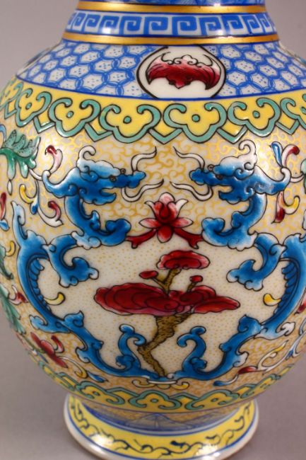 A CHINESE FAMILLE ROSE PORCELAIN VASE, with flora, bats and fungi decoration, six character mark to base, 24.5cm high.