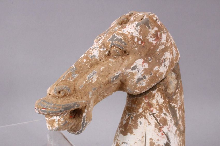 AN EARLY CHINESE HAN DYNASTY POTTERY HORSE HEAD BUST, the figure in two sections, with poly chrome decoration to the body, coupled with a perspex stand, the horse bust alone and together 17cm x 15cm