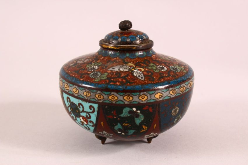A CLOISONNE KORO AND COVER, decorated with butterflies, flowers and buddhistic emblems, on three feet, 11cm high.