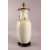 A LARGE CHINESE MONOCHROME PORCELAIN TWIN HANDLE VASE / LAMP, the lamp with a monotone colour, moulded lion dog and kylin in the canton style, mounted as a vase with a wooden stand, 60cm