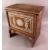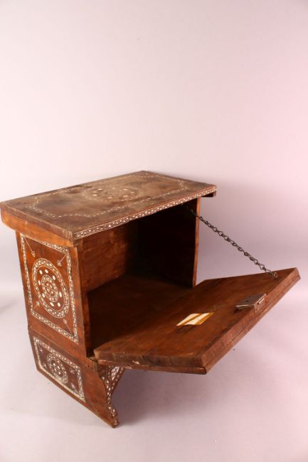 A MOTHER OF PEARL INLAID WOOD SMALL CUPBOARD, with a front drop panel door, 47cm high x 47cm wide x 27cm deep.