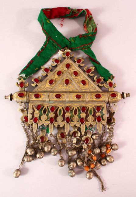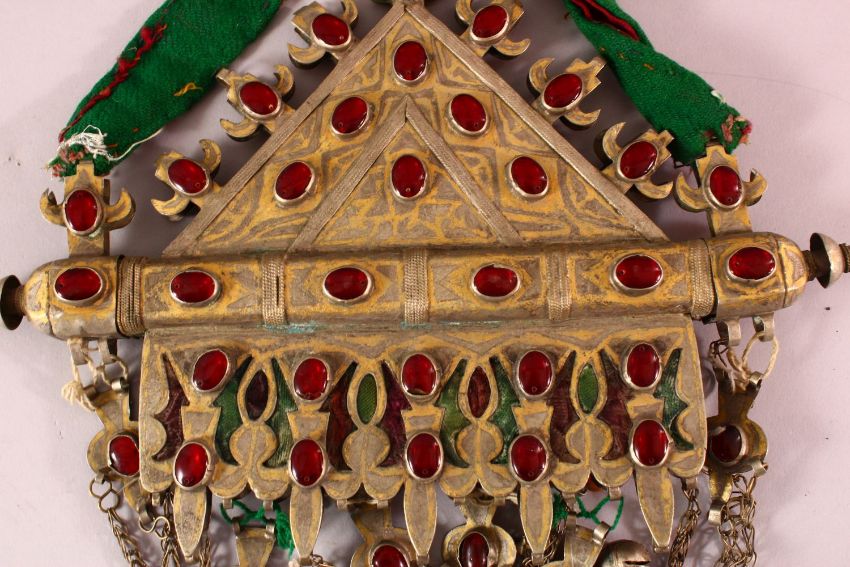 A TURKISH METAL INLAID BRIDES NECKLACE, with gilded decoration around inlaid semi precious stones, with chain hangings.