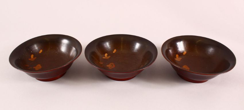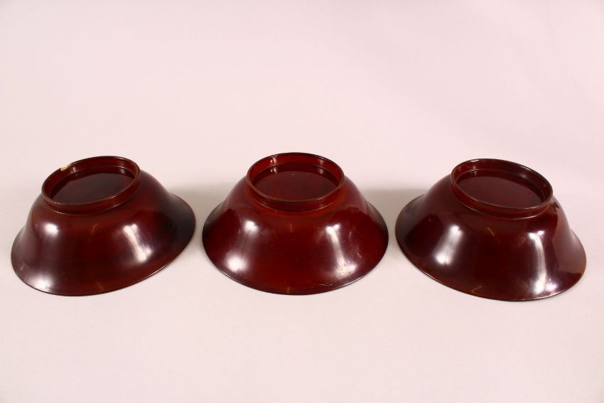 A GROUP OF THREE EARLY 20TH CENTURY MEIJI PERIOD LACQUER BOWLS, the inner decorated with mushrooms, each 18cm diameter.