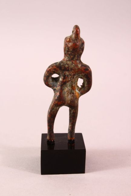 A SMALL EARLY CHINESE BRONZE FIGURE OF BUDDHA HOLDING A BOTTLE, poss neolithic, mounted to a base, 8.5cm