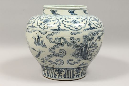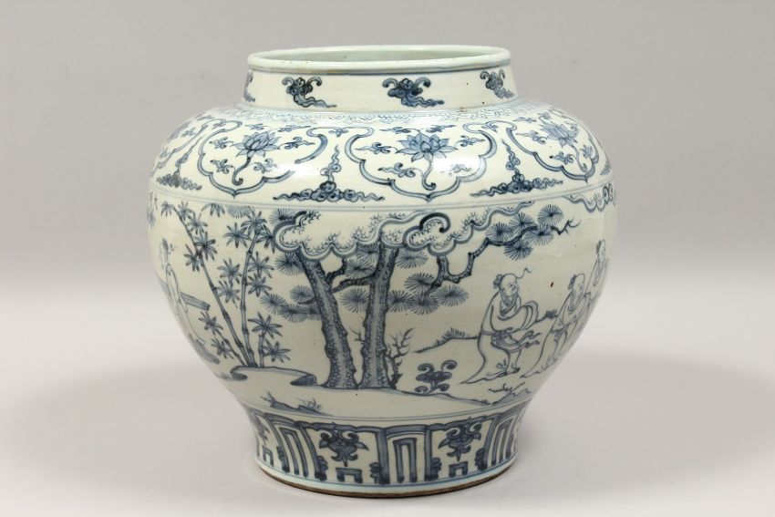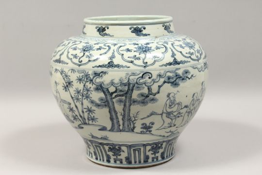 A GOOD CHINESE BLUE AND WHITE MING STYLE BULBOUS VASE with a band of figures and scrolls, 11ins high.