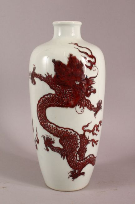 A CHINESE COPPER RED GLAZED PORCELAIN DRAGON VASE, with double blue rings to base, 32cm