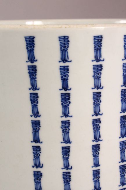 A CHINESE BLUE & WHITE PORCELAIN CALLIGRAPHIC BRUSH POT, the oversize pot decorated with calligraphy to the body, The side with seal marks, 17cm.