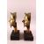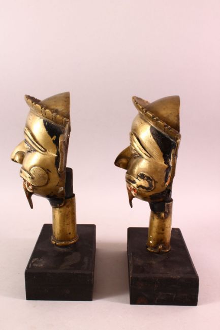 A PAIR OF 19TH / 19TH CENTURY SOUTH INDIAN BRASS MASKS OF SHIVA, each mounted on wooden bases, 26cm high
