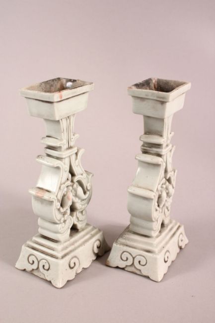 A PAIR OF CHINESE DEHUA PORCELAIN CANDLE STICKS, 18cm high.
