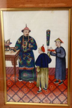 THREE GOOD FRAMED CHINESE 19TH CENTURY PAINTING ON RICE PAPER OF OFFICIALS, the gilt frames housing the paintings, each official seated with attendants, 47cm x 36cm.