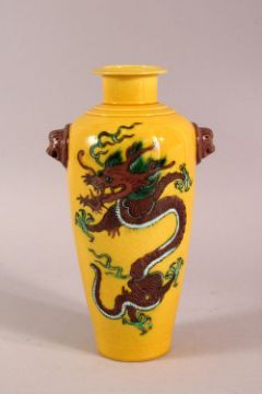 A CHINESE FAMILLE JAUNE TWIN HANDLE DRAGON PORCELAIN VASE, with twin lion dog mask handles and incised dragons, the base with a six character mark, 20cm