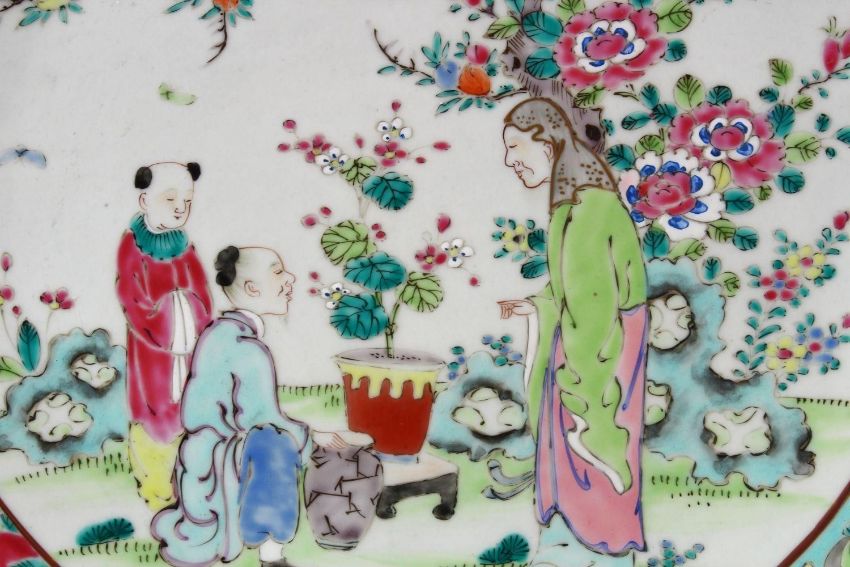 A 19TH CENTURY CHINESE FAMILLE ROSE PORCELAIN PLATE OF SCHOLARS, the decoration depicting a scholar and two figures in a landscape scenes, with borders of butterflies and peach fruit, the underside with an impressed seal mark, and a two character mark, 37cm.