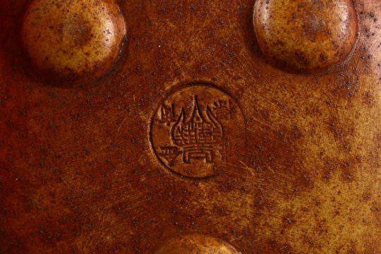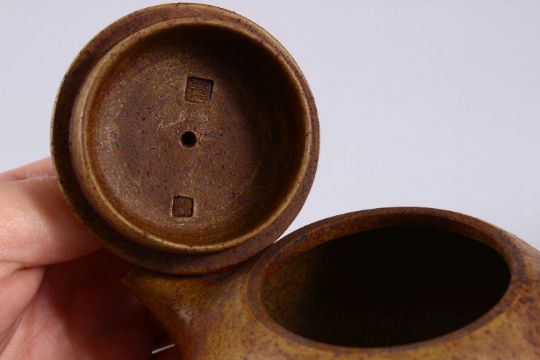 AN UNUSUAL CHINESE YIXING TEAPOT, with marks to inner lid and impressed seal mark to base, 16cm at widest point, 8.5cm high.