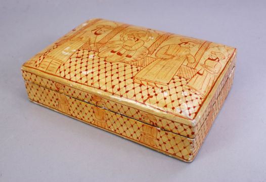 A GOOD KASHMIRI INDIAN LIDDED BOX, decorated with figures, 15cm wide x 10cm,