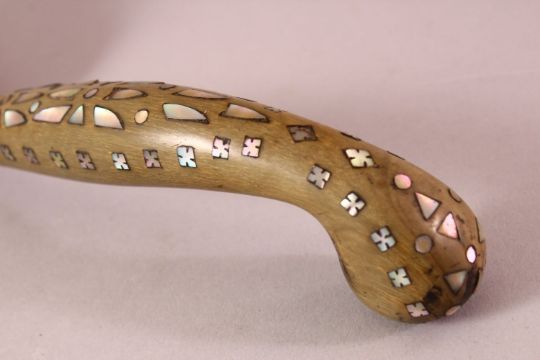 A SOUTH EAST ASIAN SILVER MOUNTED HORN AND MOTHER OF PEARL CEREMONIAL LADLE, 28cm long.