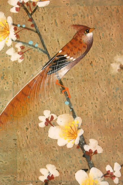 A CHINESE FRAMED PICTURE OF A BIRD, seated within a prunus tree, 53cm x 38cm.